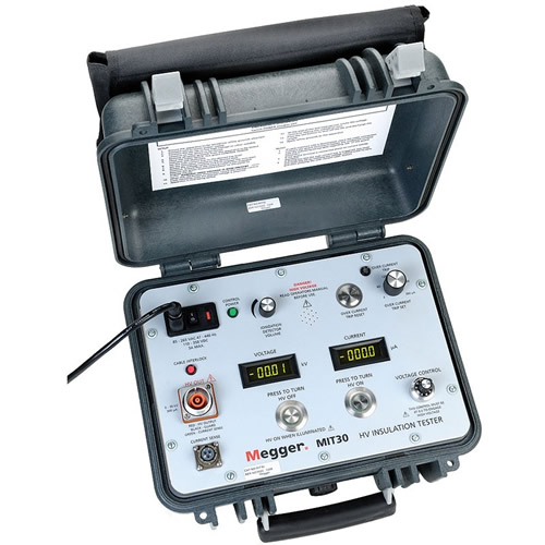 MIT30 is a 30 kV Insulation tester that has been developed to satisfy the demand for a variety of high voltage, high accuracy, low current applications in electrical distribution industries, aerospace and defense applications. The MIT30 cannot be used on grounded/earthed test samples. Otherwise, the unit will be damaged. The unit offers unparallel accuracy and resolution, with a high voltage output from 0 to 30 kV dc., trip levels from 0 – 360 µA and a resolution of 1 nA (±1.5%). The MIT30 represents excellent precision in a field instrument, and gives the operator confidence in the meaningful results. The MIT30 can be used to perform step-voltage and proof tests which, when incorporated into a routine maintenance program, can aid in predicting potential failure before breakdown occurs.