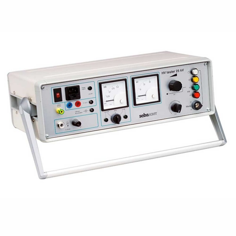 HV Tester 25 kV is a high-voltage generator with a variable negative DC output voltage of 0 – 25 kV. The condition of the test object with regard to electrical strength and insulation quality can be determined on the basis of the unit’s readings for output voltage and current. Due to its small size and internal battery this test-system is ideal for test-conditions where no external power supply is available.