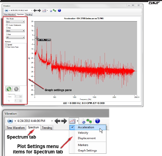 The V/I Spectrum window analyzes the frequency spectra of the three line-to-neutral voltage waveforms and the three line currents independently of each other. The current spectra have shown to contain information related to the vibration spectra of the machine; roller-bearing faults can be identified by using the frequency marker controls on the lower left. The feature can also help you find deteriorating alignment problems, load unbalances, looseness, eccentricity, and cavitation by analyzing these spectra.
